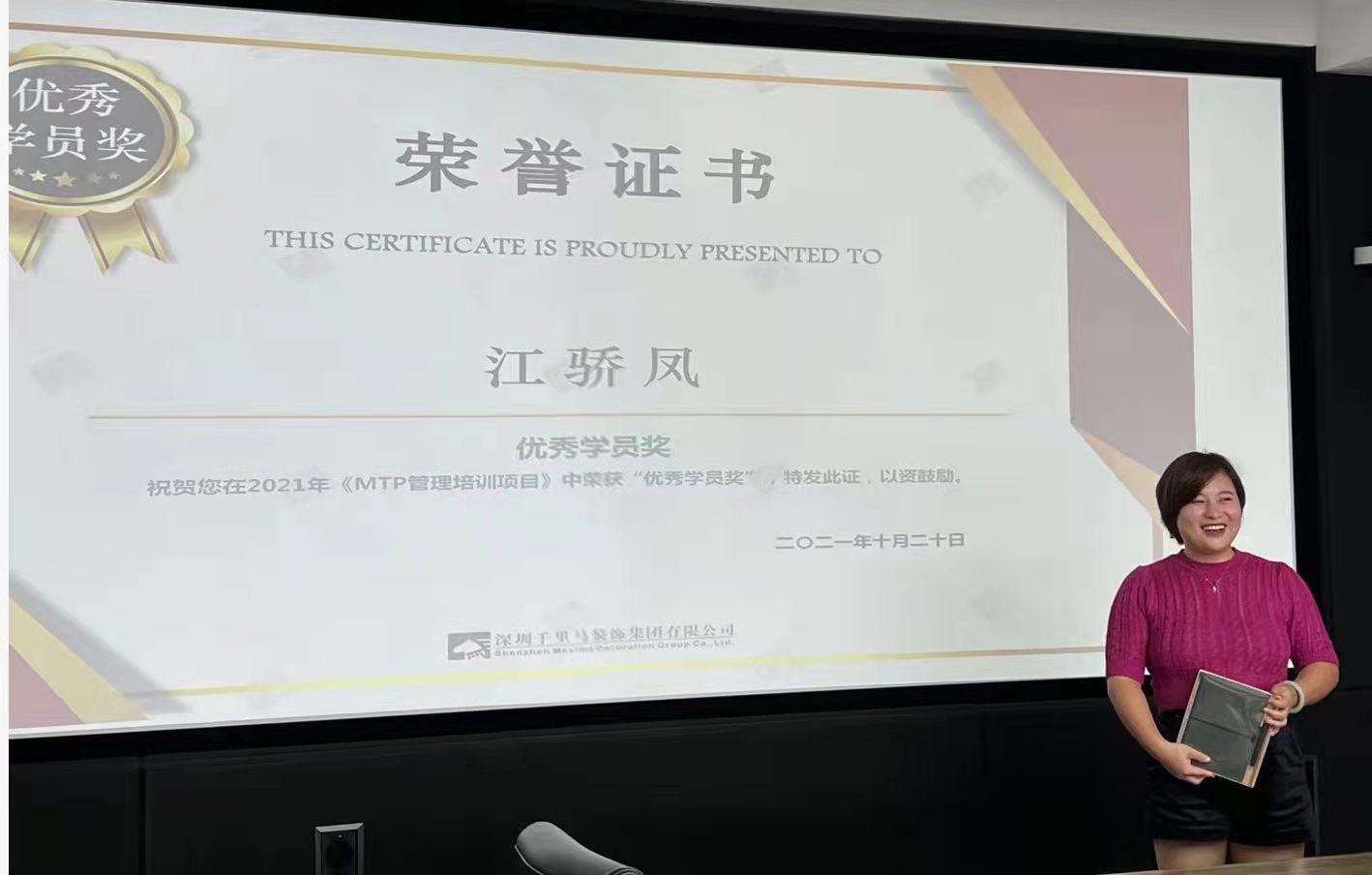 △江經(jīng)理在MTP培訓(xùn)班中被評(píng)為“優(yōu)秀學(xué)員”