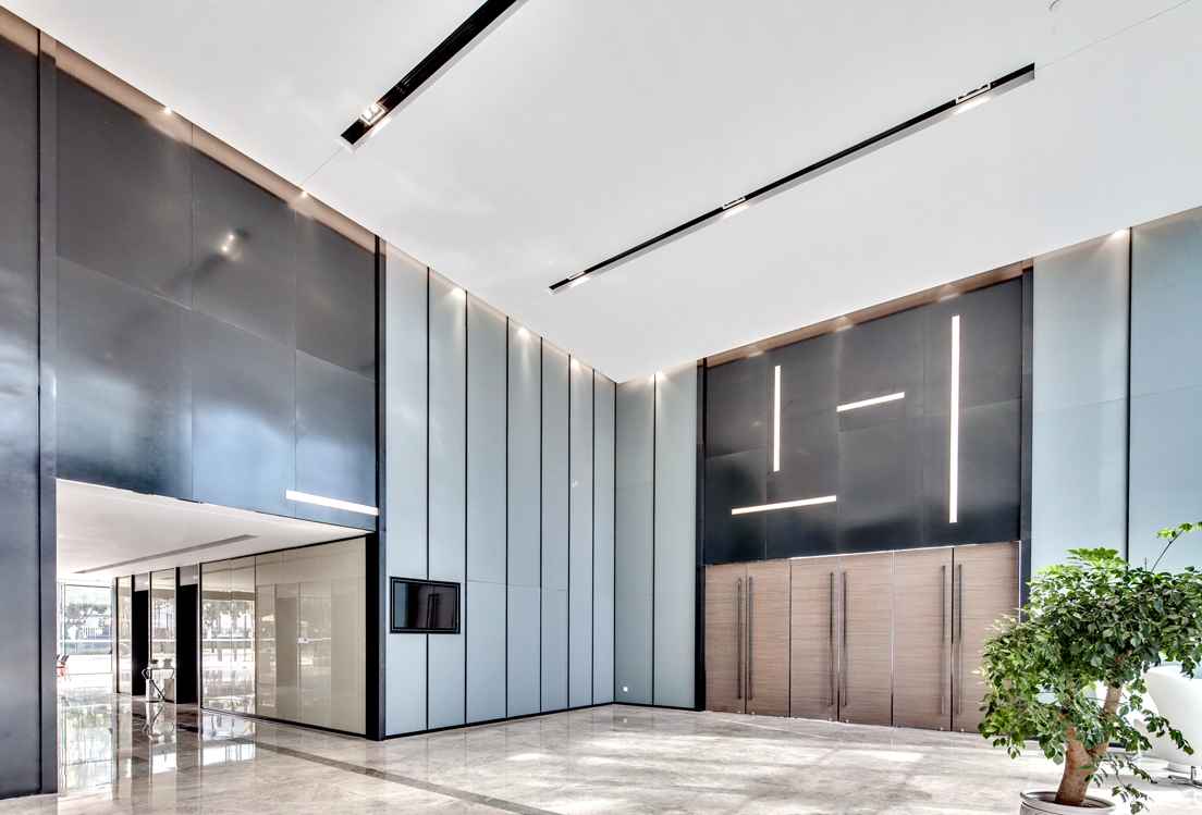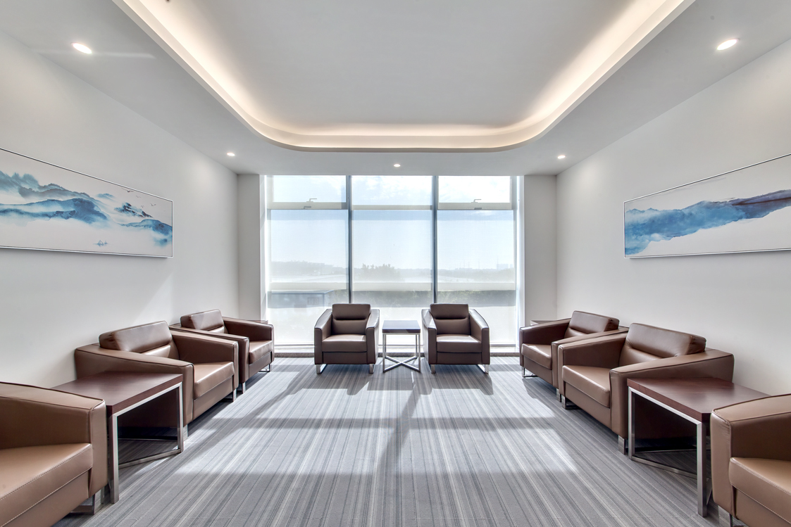 入口辦公前臺(tái)區(qū)墻面和前臺(tái)運(yùn)用幾何分割設(shè)計(jì),簡(jiǎn)約的材料遇上瘋狂的切割,便會(huì)形成獨(dú)特的形態(tài),背景墻白色乳膠漆,前臺(tái)是白色石材,地面是灰色條紋地毯。同時(shí)銷售中心和辦公室墻面以白色乳膠、水泥板、黑色不銹鋼為主,地面木地板,灰色地毯為主,水吧區(qū)域,沙發(fā)用顏色去點(diǎn)綴,在空間節(jié)奏的變化、自然光影的引入和材料肌理的運(yùn)用,為至銷售中心和辦公室創(chuàng)造豐富和有趣的觀展體驗(yàn)。